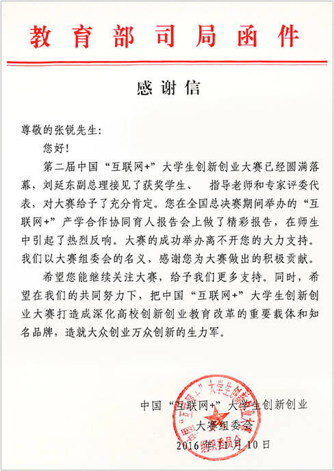2018年,米兰体育APP连续多年为中国国际互联网+大学生创新创业大赛做出积极贡献,获教育部来函致谢。